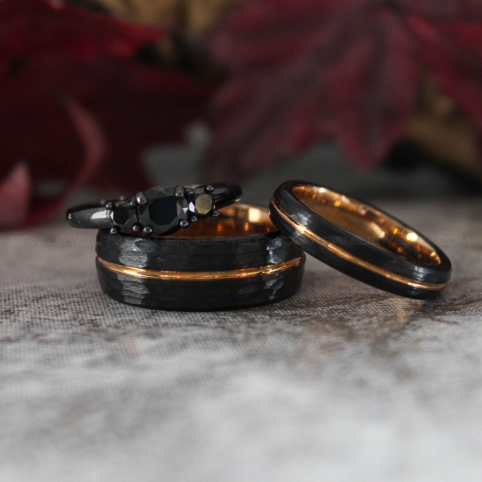 8MM BLACK TUNGSTEN BAND WITH HAMMERED FINISH ROSE GOLD GROOVE