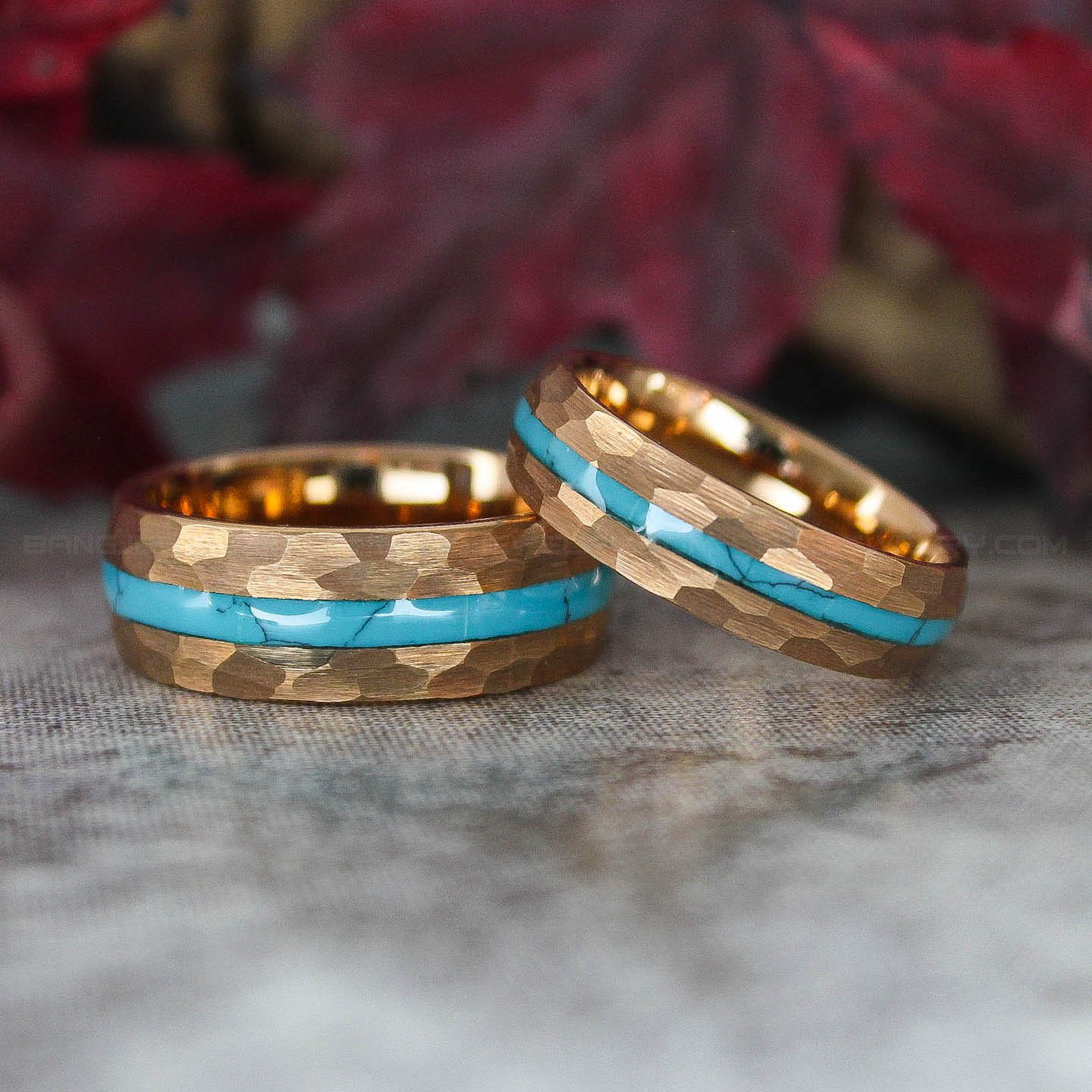 8MM ROSE GOLD TUNGSTEN BAND WITH HAMMERED FINISH TURQUOISE INLAY