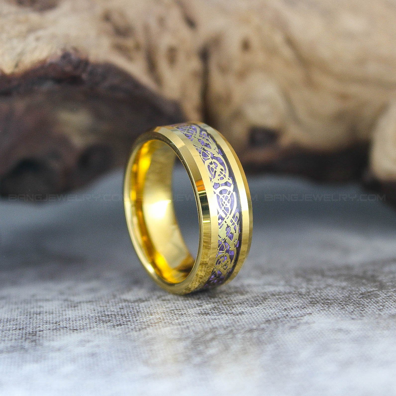 Yellow Gold Wedding Ring, Yellow Gold Tungsten Band with Purple Center Carbon Fiber Dragon Inlay Pattern, Yellow Gold Tungsten Wedding Ring